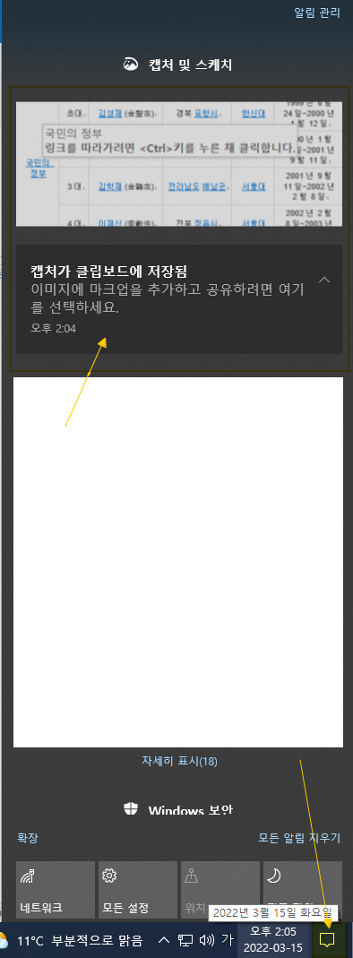오른쪽에 알림이 뜨면 거기를 클릭해 주시면 캡쳐/스케치 편집 프로그램이 시작됩니다.