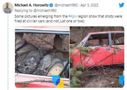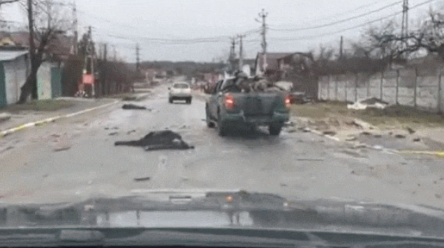 실제 AFP 통신과 영국 가디언 등 국제 언론은 "자전거에 탄 채로 고꾸라진 시신, 총탄 자국이 난자한 자동차 앞에 널브러진 시신, 도로 한복판에 쓰러진 시신 등 희생자들은 모두 무고한 주민들이었다. 어느 도로변에서는 러시아군이 불태우려했던 시신 4구도 확인됐다. 아나톨리페도루크 부차 시장은 도시를 되찾은 뒤 시신 280구를 수습해 마을 공동묘지에 안치했다며 이것이 러시아 점령의 결과라고 분노했다." 고 전했다.