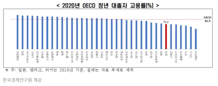 먼저 고용의 질을 따지기 전에 고용률 자체를 볼 때에도 우리나라는 OECD 소속 37개국 중 31위라는 우울한 결과가 나왔습니다. 고용률은 75.2% 였습니다. 특히 우리나라의 낮은 고용률의 원인으로는 경제활동에 참가하지 않는 비경제활동 인구가 많기 때문이었습니다. 이 인구 비율은 20.3%로 OECD 37개국 중 3번째로 높은 수치를 기록하고 있었습니다. 취준생도 취준생이지만 그냥 취는 대졸자가 많다는 것이 우려스러운 전망을 갖게 하는 부분입니다.