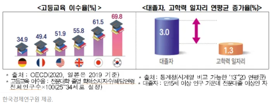 그 이유를 좀더 잘 알아볼 수 있는 해답은 우리나라의 유독 높은 고등교육 이수율과 이에 못 미치는 고학력 일자리 증가율의 차이입니다. 우리나라는 청년 교육 이수율 69.8%로 OECD 37개국 중 1위를 차지했지만 이처럼 고학력 일자리 (관리자, 전문가, 사무 종사자)는 이에 한참 부족한 것으로 드러났습니다. 실제 연평균 대졸자는 3% 증가하는데 반해 고학력 일자리는 1.3% 증가하는데 그치고 있습니다.