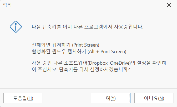 설치하고 나서 바로 픽픽 프로그램을 실행하면 아래와 같이 단축키가 중복된다는 메세지가 뜹니다. 사실 상관없어서 굳이 신경쓸 필요는 없습니다. 다만 예를 눌러서 내가 사용하기에 편리한 키로 단축키 조합을 바꿔주는 것이 좋습니다.