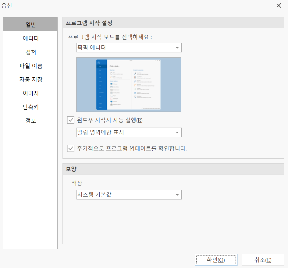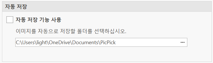 다음으로 중요한 설정 중 하나는 자동 저장 설정입니다. 픽픽 프로그램 메인 메뉴에서 가장 왼쪽 아래에 있는 옵션을 누르시고 들어가면 됩니다. 그런 오른쪽 같은 화면이 뜹니다.