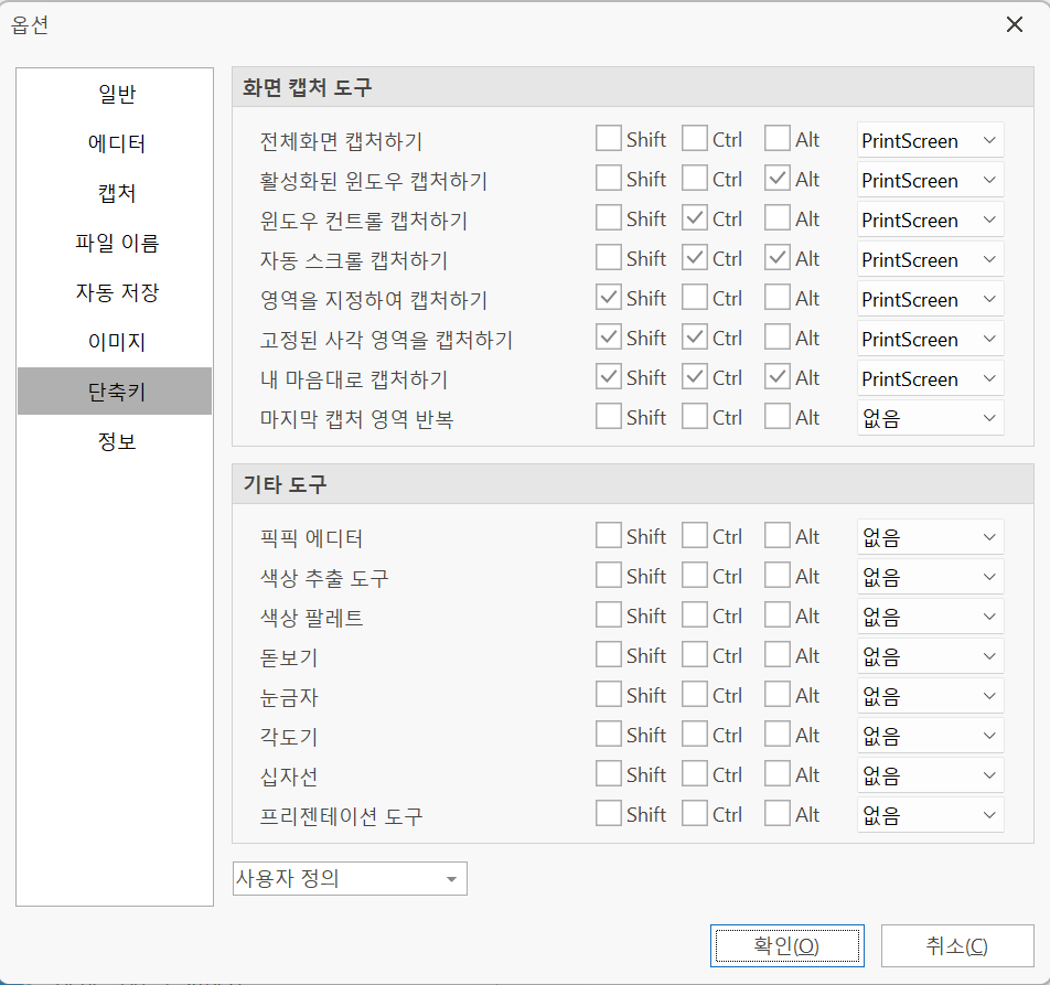예를 누르면 뜨는 화면 캡처도구 단축키 설정화면