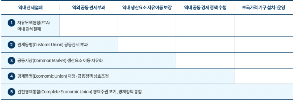 자유무역협정으로 보통 5 단계로 그 협정의 깊이가 구분됩니다. 1 단계의 예로는 NAFTA (북미 자유무역협정)이 있고 가장 높은 수준의 5단계의 대표적인 예는 EU (유럽연합)입니다.