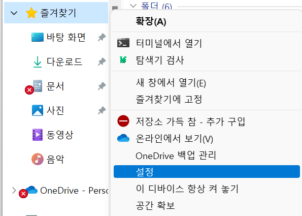 윈도우 탐색기를 여셔서 왼쪽 원드라이브 창에서 마우스 우클릭을 해줍니다. 그리고 창이 뜨면 그 중 "설정" 항목을 클릭해주시면 됩니다.