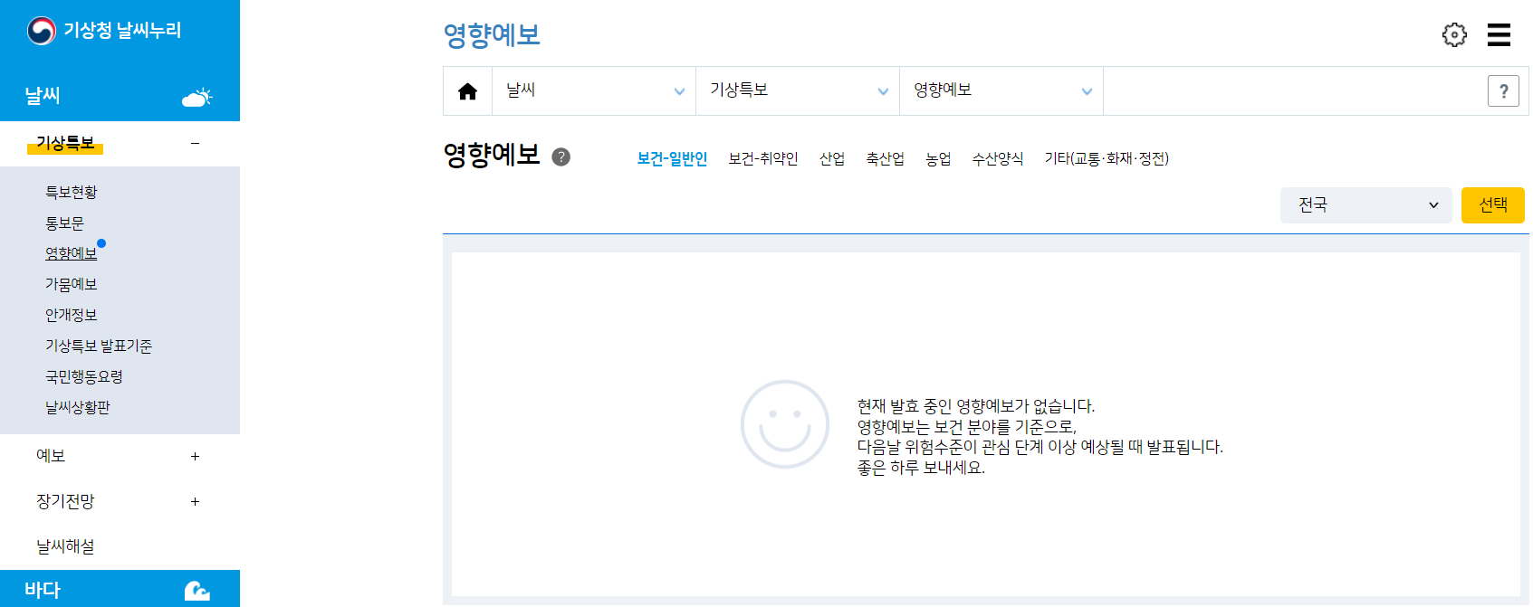 ② 주메뉴 → 날씨 → 기상특보 → 영향예보 선택