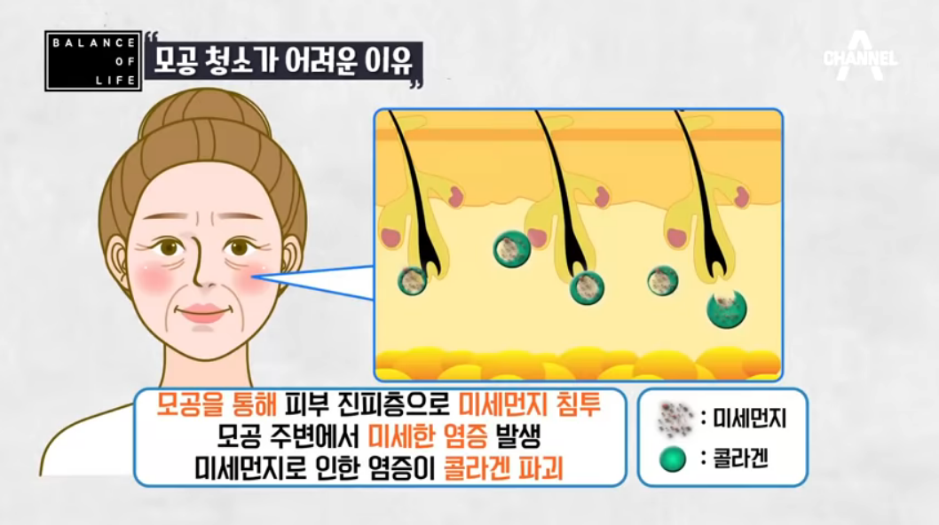 또한 노폐물들은 우리 피부에 나있는 작은 구멍들,,, 모공으로 들어가 정상적으로 배출되어야 할 피지 배출을 막아 피부 건강 악화와 노화를 가속시킵니다. 그리고 모공으로 들어간 노폐물들은 표면에 있을 때 보다 더 씻겨내기 힘든 상태가 되서 모공에 박혀 굳어지며 노화를 촉진하는 악순환이 시작되게 됩니다.