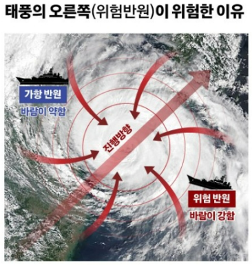 태풍은 많은 사람들이 아는 것처럼 반시계 바향으로 회전하는 모습을 보이는데 통상 북반구에서는 진행방향의 오른쪽 반원이 위험 반원이고, 남반구에서는 진행방향의 왼쪽 반원이 위험반원으로 여겨집니다. 하지만 위험반원이 아닌 반대쪽이 상대적으로 약하다는 말이지 항상 안전하다는 의미는 아닙니다. 실제 우리나라의 경우에도 안전반원에 위치한 태풍 영향권에서도 많은 피해를 입은 전력이 있습니다.