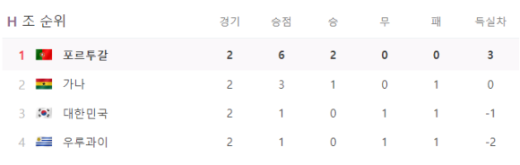 오늘 마지막 경기를 앞둔 상태에서의 H조 순위와 승점입니다. 보시면 알겠지만 일단 우리나라가 16강에 진출하는 것은 사실상 굉장히 어려운 일이 되어 버렸습니다. 우루과이가 4위이고 우리나라가 3위 이지만 우리는 가장 강팀인 포르투갈을 상대해야 하기 때문입니다.
