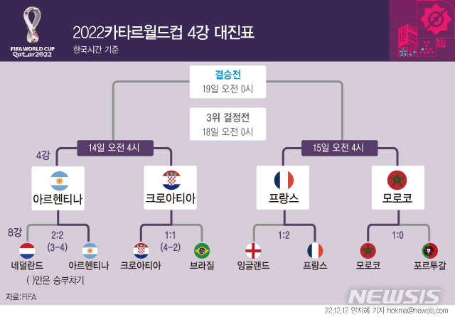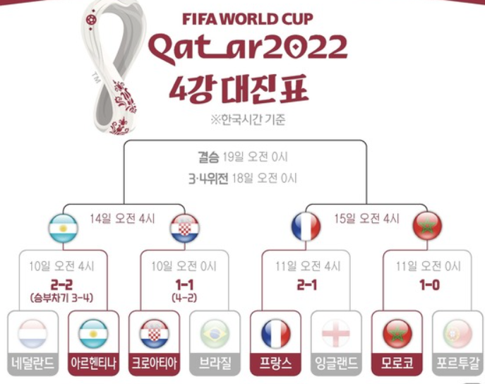 이 결과 리오넬 메시를 앞세운 아르헨티나가 크로아티아와 만나며 프랑스는 아프리카 최초로 4강 신화를 이룬 모로코를 상대하게 됩니다. 카타르 월드컵 4강 대진표를 참고하세요!