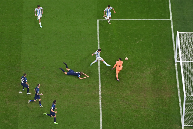 이 경기 승부의 행방은 전반 32분 알바레스의 일대일 기회를 막으려던 크로아티아 골키퍼의 파울로 인한 페널티킥에서 부터 보이기 시작했습니다. 키커로 나선 메시가 골을 성공 시키며 대회 5번째 골로 킬리안 음바페(프랑스)와 득점 공동 선두에 오르고, 월드컵 통산 11호 골로 역대 공동 6위가 됐습니다.
