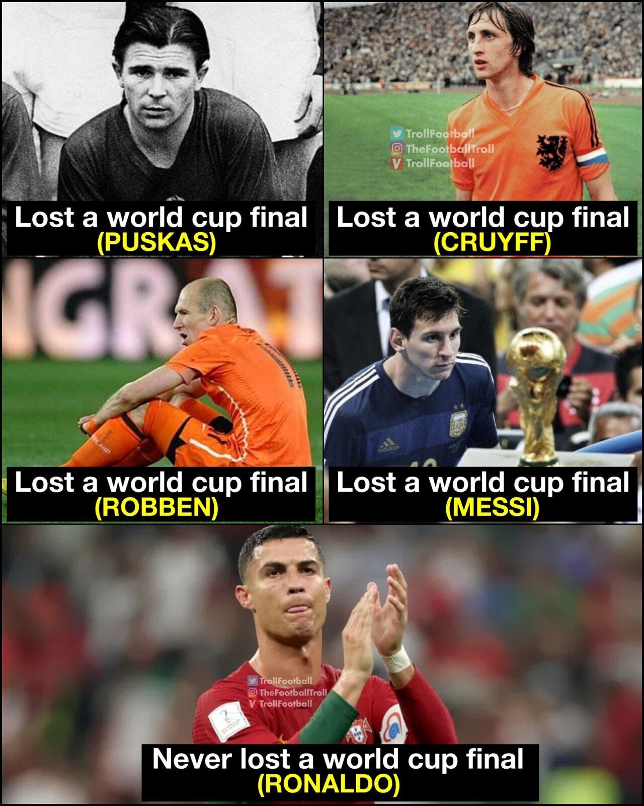 이런 메시라도 호날두가 훨씬 뛰어난 한 부분이 있습니다. 바로 월드컵 결승전에서 단 한번도 지지 않았다는 것이죠!! 호날두는 월드컵 결승에서 무패의 전적을 보유해 패배를 경험한 메시는 물론 동일하게 월드컵 결승에서 패배를 경험한 푸스카스, 크루이프, 로벤 등 보다 훨씬 뛰어나다는 농담이 인터넷에 퍼지고 있습니다.