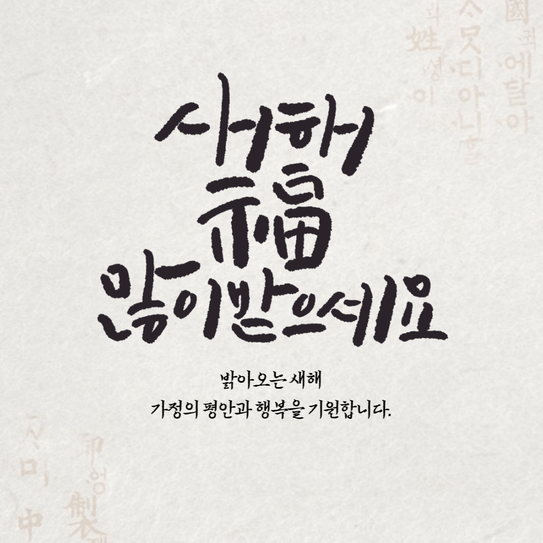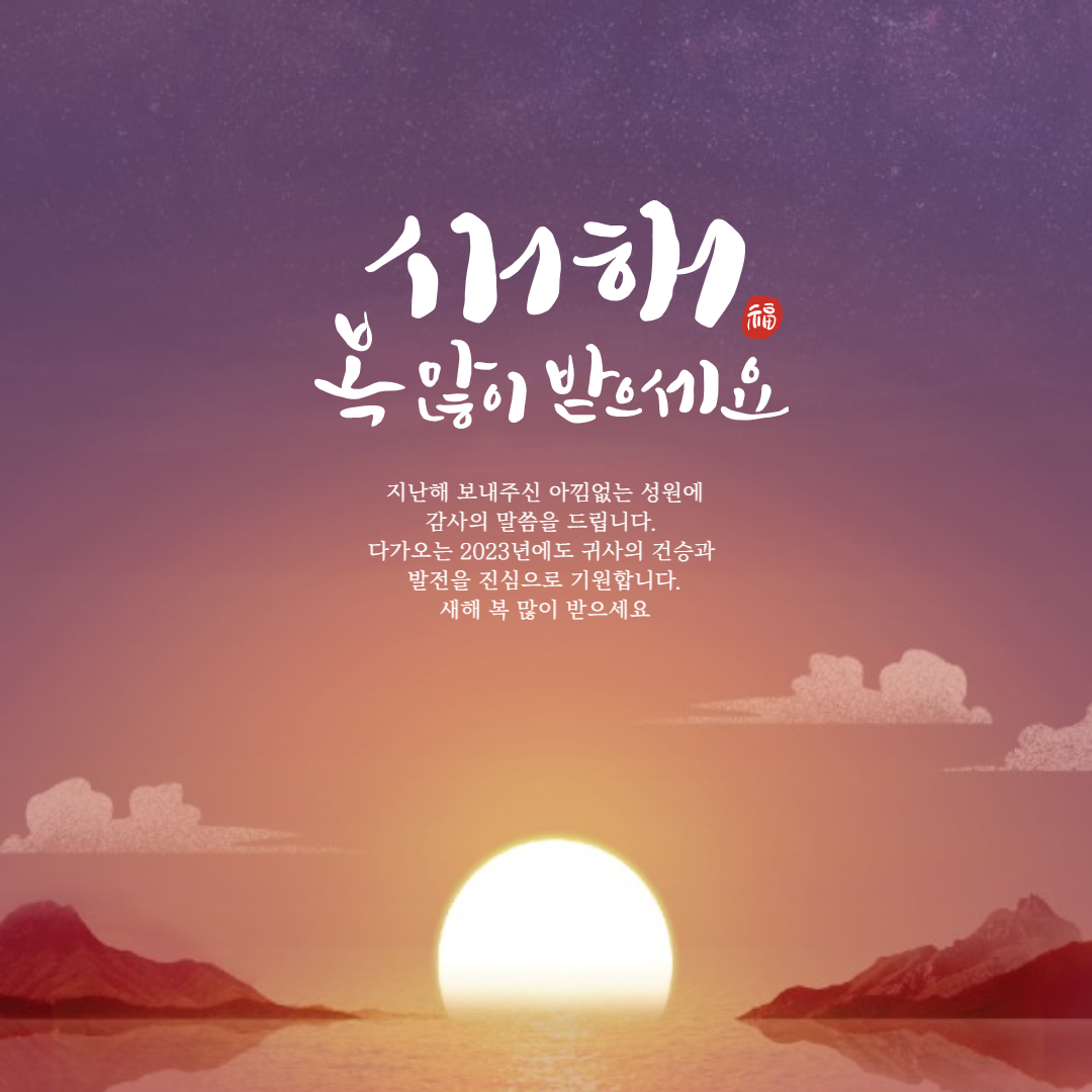 지난해 베풀어 주신 은혜와 한결같이 보내주신 성원에 감사합니다. 새해에도 건강하시고 평안하시길 기원하며, 올해도 따뜻한 마음을 나눌 수 있길 바랍니
