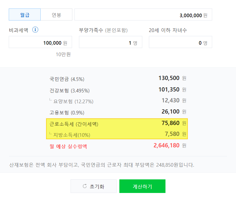 자 그럼 얼마를 징수하는가? 네이버 월급 실수령액 계산기에서 시뮬레이션을 해보면, 세전 월급이 300만 원이라도 각종 항목을 제외하고 실수령액은 264만 6180원인 것을 확인할 수 있습니다.