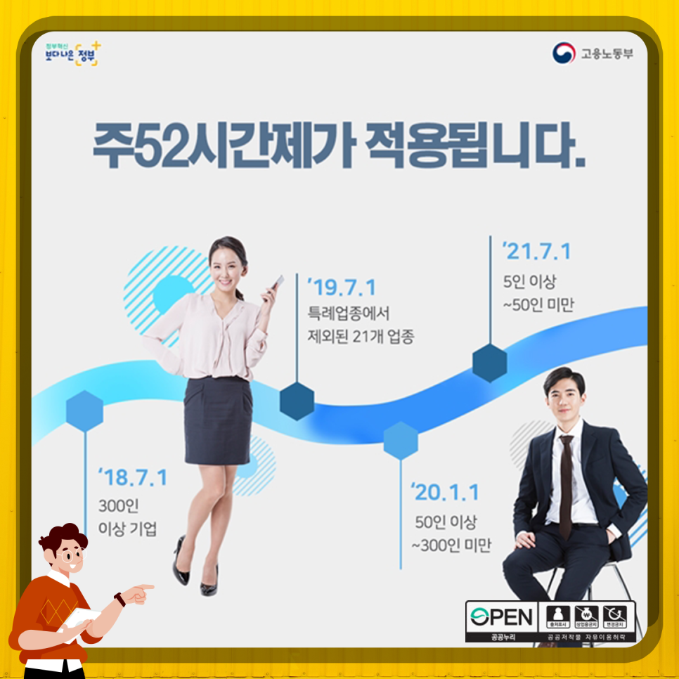 주 52시간 법이 도입되기 전에는 일주일에 최대 68시간 까지 일할 수 있었는데 주 52시간 법 도입과 함께 한 주에 최대 근로시간이 68시간에서 52시간으로 총 16시간이 단축 되었습니다.