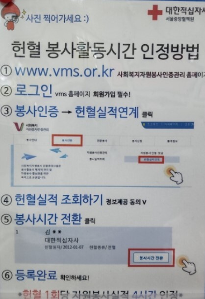 2010년 7월 1일부터 헌혈 1회당 4시간씩 봉사시간을 인정 받을 수 있게 되었습니다. 단, 봉사시간 인정은 사회복지 봉사활동 인증관리 시스템(www.vms.or.kr)에 본인이 직접 사전 등록해야하는 점 잊지 마시기 바랍니다.