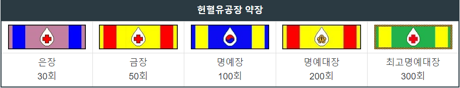 헌혈 유공장에는 은장, 금장, 명예장, 명예대장, 최고명예대장 이렇게 5가지 단계가 있으며 각각 아래와 같이 헌혈 횟수를 충족하면 수상할 수 있습니다. 타인의 생명을 위한 훌륭한 봉사인 만큼 제대로 예우를 해주는 느낌이 듭니다.