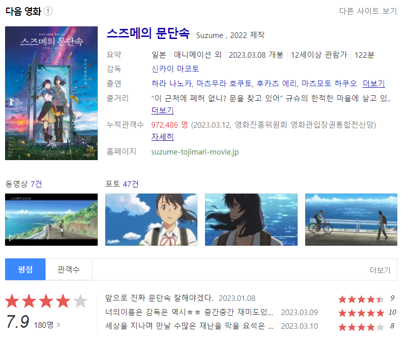네이버와 다음 평점을 기존의 재난 3부작이라 불리는 신카이 마코토 감독의 다른 2 영화와도 비교해 봤다. 이렇게 보니 너의 이름은이 가장 높고 날씨의 아이와 스즈메의 문단속은 뭔가 비슷한데 옆치락 뒤치락하는 것 같다.