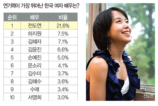 한국갤럽 ‘올해의 영화배우’ 조사에서 2007년 1위를 했는데 이는 여배우가 1위를 한 최초이자 마지막이다. 갤럽 올해의 배우 부문 최고 점유율을 기록하기도 했고 2019년 한국 영화 100년을 맞아 100명의 영화 전문가가 꼽은 최고의 여배우 조사에서 1위를 하였다.