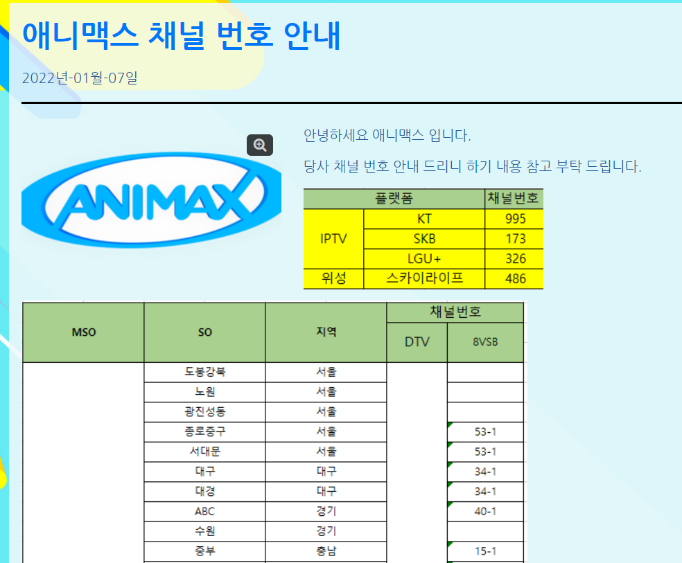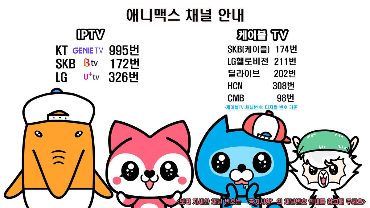 요즘 다양한 IPTV 회사들이 있는데 각 회사마다 번호가 다릅니다. 가장 유명한 IPTV 회사들의 애니맥스 채널 번호를 안내해 드립니다.