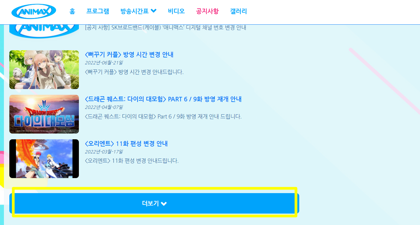 1. ANIMAX 홈페이지 상단 메뉴 "공지사항"을 클릭해 주세요.