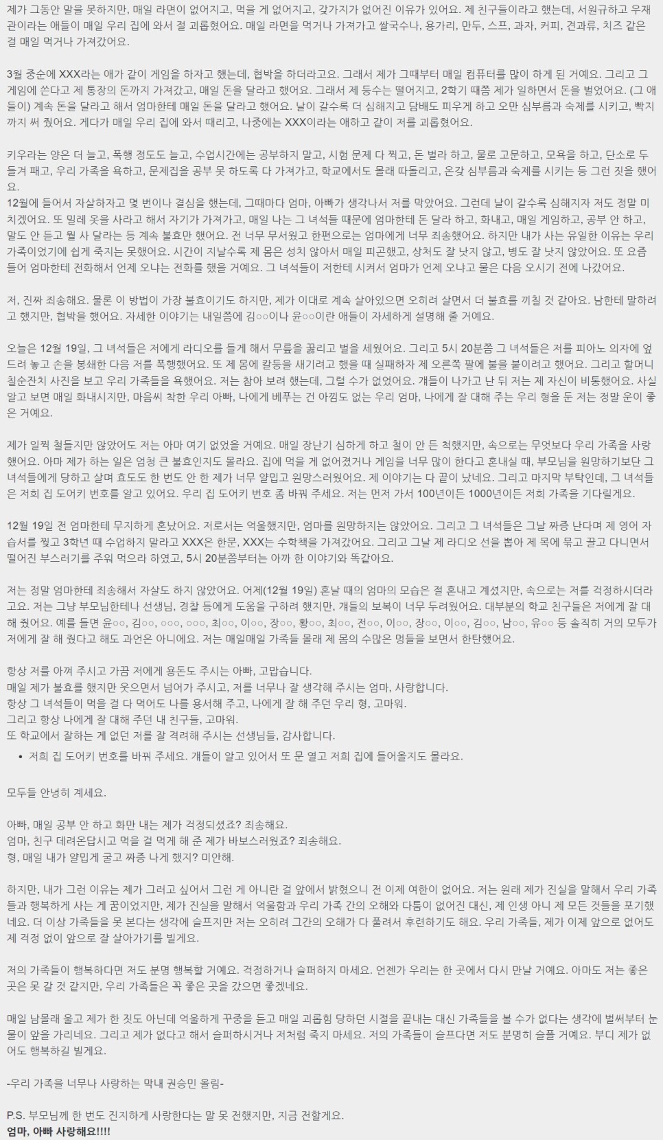 더 심한 것은 승민이의 등에 칼등을 세기려고 했으며, 팔에 불을 붙이려고도 했다고 해요. 그리고 승민이 가족사진을 보며 가족 욕을 했다고 합니다. 권승민 유서에는 여러번 강조된 내용이 있대요 바로 '현관문 비밀번호 변경' 가해자들이 비번을 알고 있어서 자신이 없을 때 문을 열고 들어올지도 모른다며 꼭 바꾸라고 했다고 합니다.