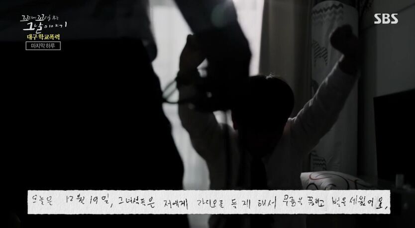 승민이가 스스로 자살을 하기 전 두달의 기록을 보면 가해자들은 30번이나 승민이 집에 왔다고 합니다. 승민이에게 라면을 끓이라고 시키고 자신들이 음식을 먹는 동안 승민이에게는 숙제와 게임을 시켰다고 해요. 그리고 상습적으로 보이지 않는 곳을 구타했다고 합니다.