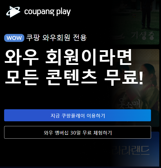 쿠팡플레이 무료보기 방법을 안내해 드립니다. 쿠팡 플레이는 '쿠팡 와우 맴버십 한 달 무료 체험'을 이용해서 보는 것이 유일한 방법 입니다.