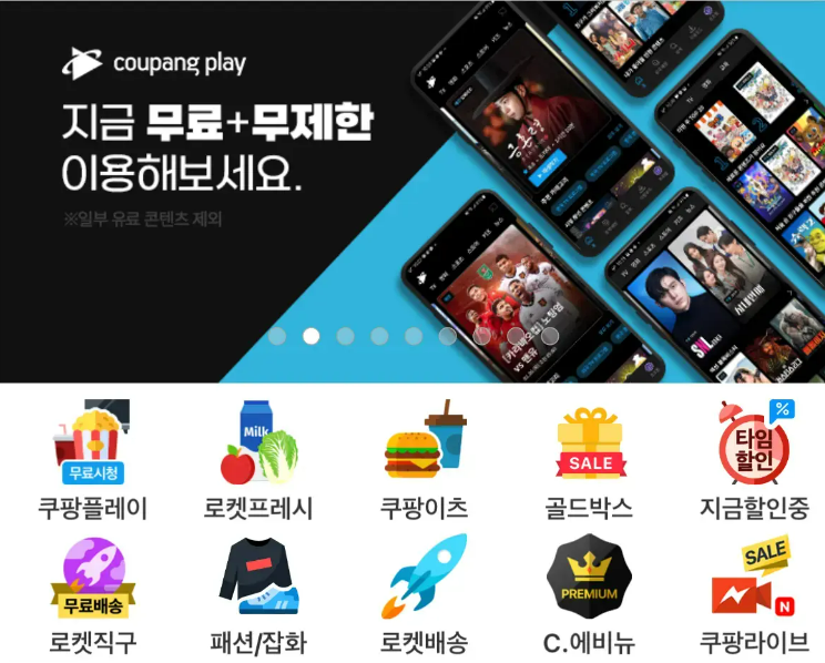 - 쿠팡 앱 접속 후 상단 배너 중에 '쿠팡플레이 무료 무제한 배너'를 클릭