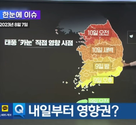 카눈은 10일 오전 3시 경남 통영 남쪽 120㎞ 해상을 지나 계속 북진하며 이후 국내에 상륙해 같은 날 오전 9시 통영 북서쪽 40㎞ 지점에 이를 예정입니다. 즉 10일 아침에 전남과 경남 사이 남해안으로 상륙할 가능성이 높은 것입니다.