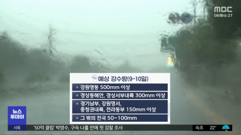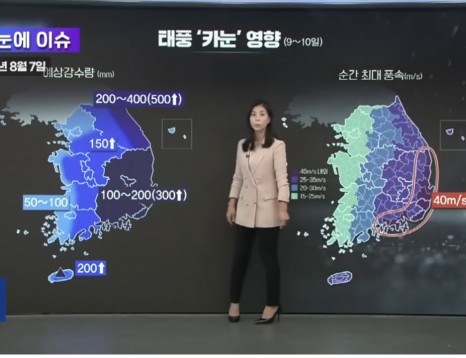 9~10일 강수량은 강원영동 200~400㎜(많은 곳 500㎜ 이상), 영남 100~200㎜(경상동해안과 경상서부내륙 많은 곳 300㎜ 이상), 나머지 지역 50~100㎜(제주산지 많은 곳 200㎜ 이상, 경기남부·강원영서·충청내륙·전라동부·제주중산간 많은 곳 150㎜ 이상)에 달할 것으로 예상됩니다. 태풍 카눈은 11일 오전 9시 함흥 남서쪽 40㎞ 지점까지 북상하고 이어 12일 오전 9시 한반도를 넘어 중국 동북지역에 이르러 온대저기압으로 약화하겠습니다.