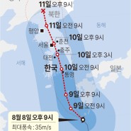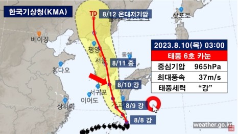 태풍 카눈은 10일 오전 3시 ‘강’ 상태로 제주도 서귀포 동쪽 약 170km 부근 해상을 지날 것으로 예상됩니다. 그리고 기상청은 예보에 따르면 같은 날 오후 3시 ‘중’으로 위력이 누그러진 상태로 충북 충주 남쪽 약 100km 부근 육상을 지날 것으로 예상됩니다. 이어 11일 오전 3시 서울 북북동쪽 약 40km 부근 육상을 거쳐 같은 날 오후 3시엔 평양 북동쪽 약 70km 부근 육상을 지날 것으로 예상하고 있습니다.
