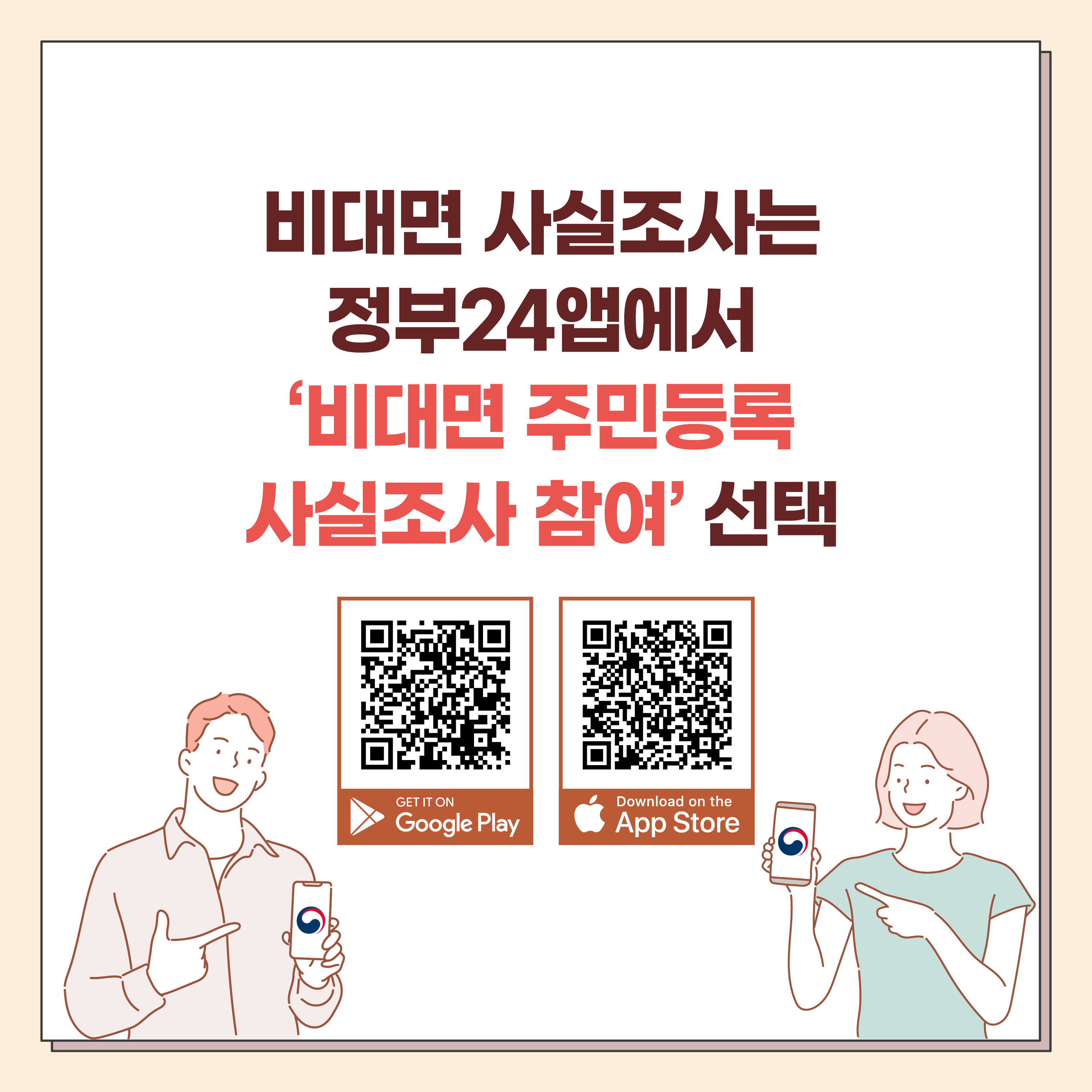 비대면 주민등록 사실조사는 2022년 사실 조사부터 도입이 되었는데 조사 대상자가 정부 24 애플리케이션에 접속해서 응답만 해주시면 간단하게 가능한데 참여한 경우 그 이후 진행이 되는 방문 조사에 참여를 하지 않아도 됩니다.