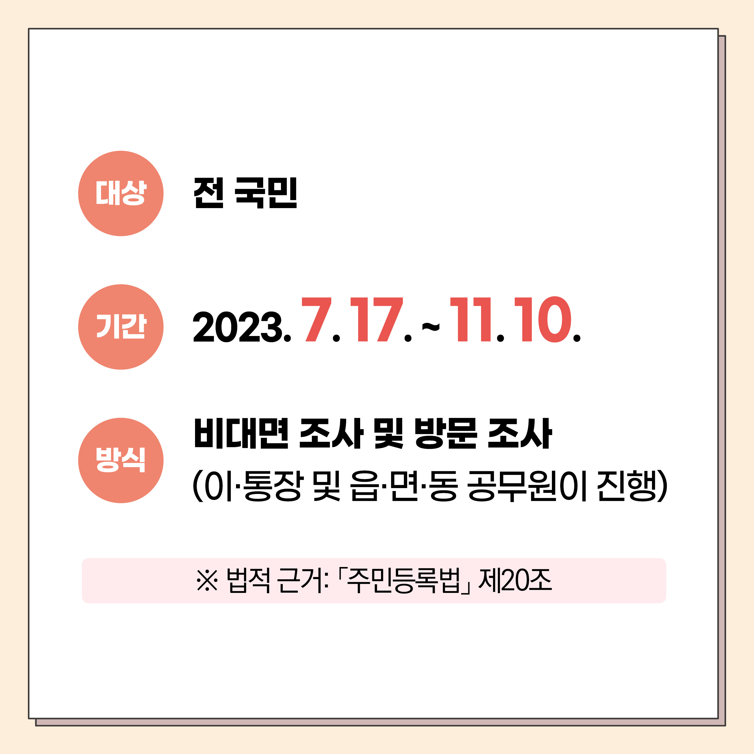 올해 2023년 7월 17일 부터 11월 10일까지 전 국민을 대상으로 주민등록 사실조사를 실시한다고 합니다.