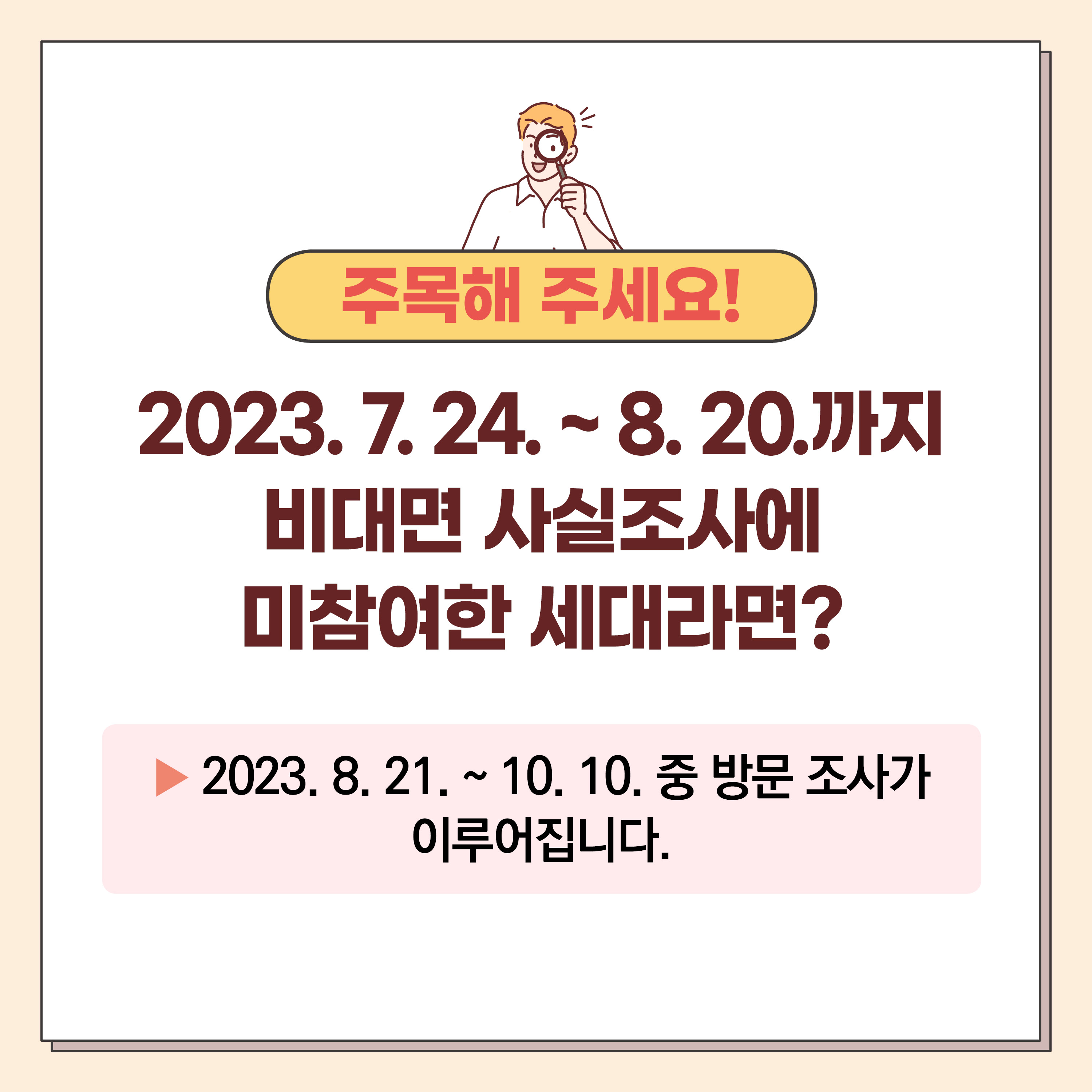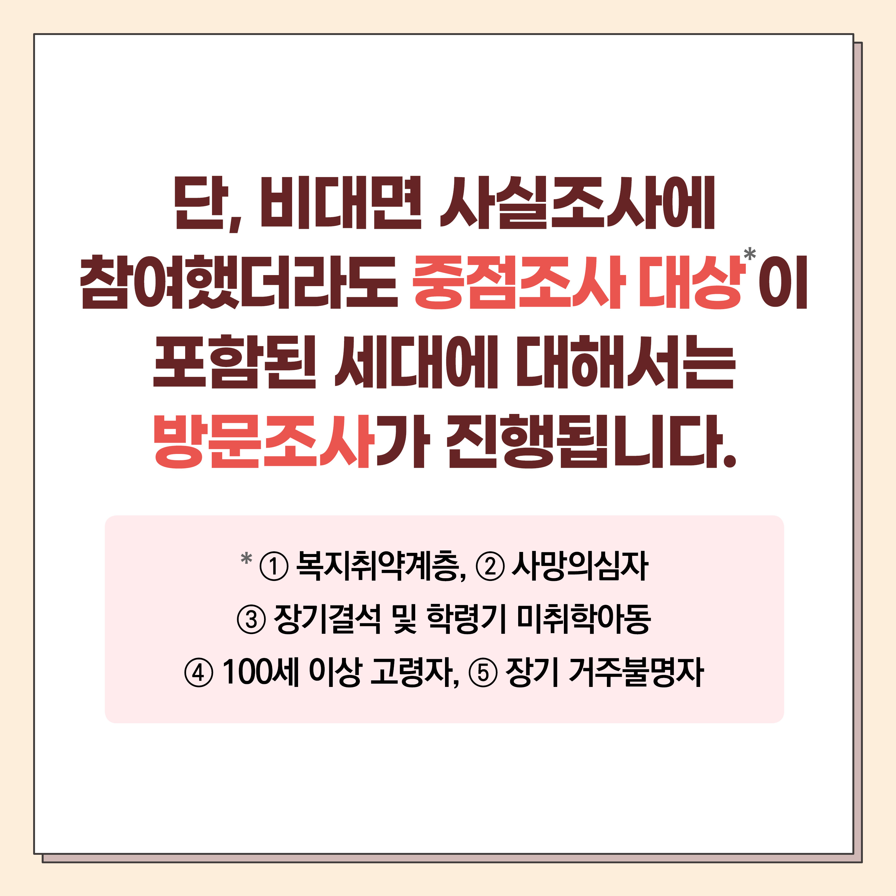방문 조사는 비대면에 참여하지 않은 세대와 중점 조사 대상 세대만 실시하며, 실 거주 여부에 대한 자세한 사실 조사가 필요한 중점 조사 대상 세대는 비대면 조사에 참여를 했다고 해도 대상에 포함이 됩니다.