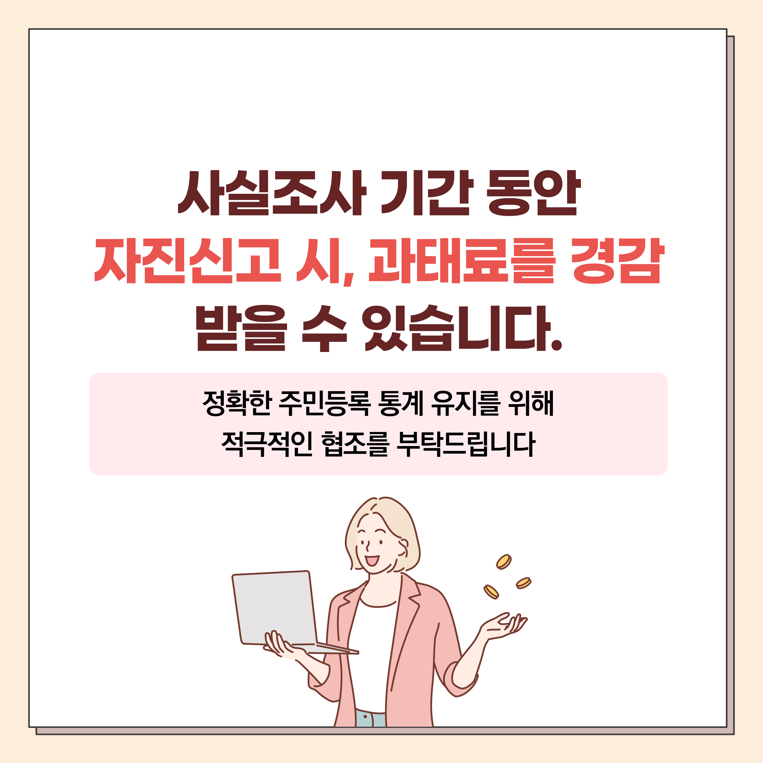 특히나, 이번 조사 기간 중에는 출생 미등록 아동 신고 기간도 함께 운영이 되는데요. 기간 중 자진 신고를 하는 경우 주민 등록법에 따라서 부과가 되는데 과태료를 최대 80%까지 감면을 받을 수 있습니다.