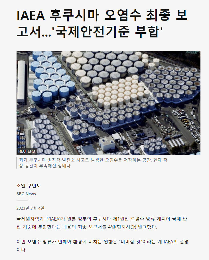일단, IAEA가 분명히 자신의 책임으로 오염수 방류를 안전하다고 했느냐 하면 그렇지 않습니다. "그저 기준치 이하로 방류하면 괜찮을 것 같아"라고 의견을 준 것과 마찬가지 인데요. 상식적으로 생각해보면 어떤 국제기구 또는 단체가 이거 괜찮아라고 말하며 책임을 지려고 할까요? 다양한 국제적 역학관계에 따라 자신들의 기준으로 평가하고 조언을 해준 것에 불과합니다.