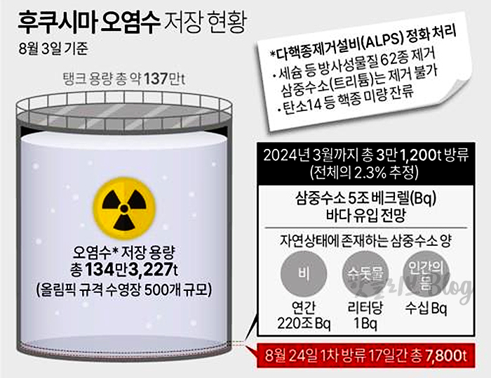 이 사고로 인해 녹아내린 핵연료는 계속해서 바닷물, 빗물, 지하수 등과 접촉하고 있어 오염수가 계속 생기고 있는 것이 문제의 원인입니다. 사고로 부터 약 12년이 지난 현재 후쿠시마 원전 오염수 양은 134만t으로 올림픽 경기용 수영장 500개에 달하는 규모라고 합니다. 일본 정부는 저장 탱크가 97% 이상 차버려서 더는 오염수를 보관할 수 없게 되어 이 오염수를 희석해 방류하겠다고 발표했습니다. 이 소식에 전국이 난리가 나게 되었습니다.