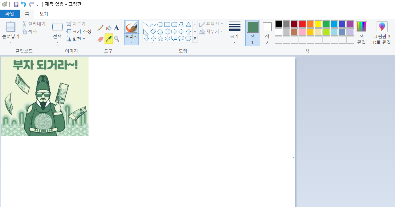 그림판 상단의 스포이드 아이콘을 클릭하면 그림에서 원하는 색깔을 추출할 수 있습니다. 스포이드 아이콘 클릭 후 추출하고싶은 색깔을 클릭하면 색1 에 방금 스포이드로 클릭한 색이 추출된 것을 보실 수 있을 겁니다.