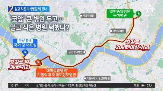 여당은 물론 많은 누리꾼들은 녹색병원 이송에 대해 의문을 표하고 있습니다. 이유는 녹색병원이 이대표가 검사를 받은 서울 여의도성모병원에서 찻길로 20km 이상 떨어져 있기 때문입니다. 녹색병원으로 가는 길 주변에만 해도 서울성모병원, 순천향대병원, 한양대병원 등 대형 병원이 많은데도 불구하고 그 멀리 갔기에 많은 의혹이 생기는 것 같습니다.