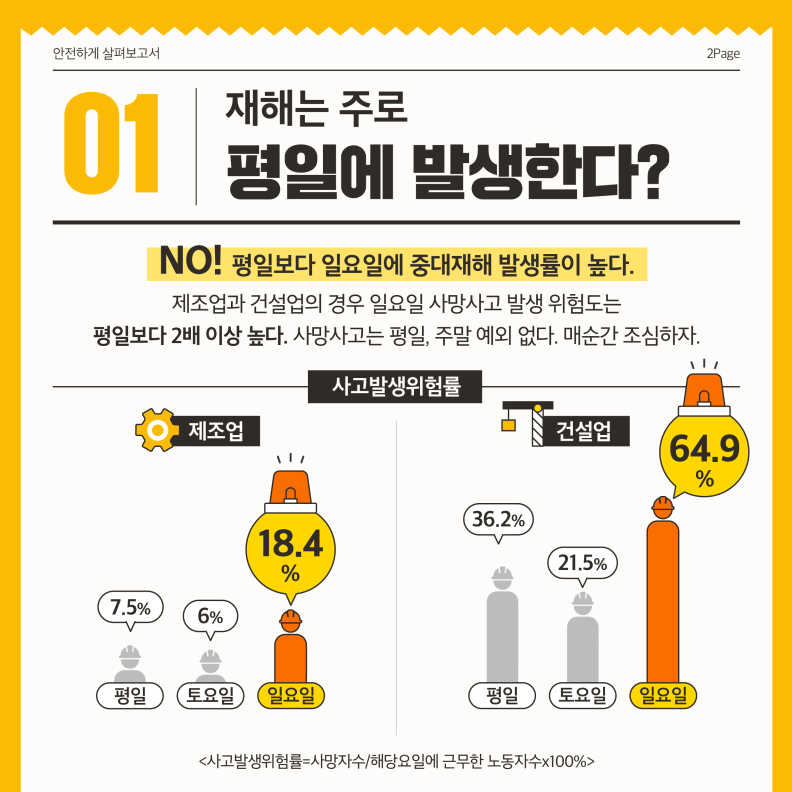 많은 사람들이 가장 많이 하는 생각인 것 같습니다. 근무일이 보통 평일이다 보니 사고도 평일에 많이 생긴다고 생각하기 쉽습니다. 하지만 실제 사고 데이터를 분석해 보면 평일보다 일요일에 중대재해 발생률이 높습니다. 특히 제조업과 건설업의 경우 일요일 사망사고 발생 위험도는 평일보다 2배 이상 높다고 합니다.