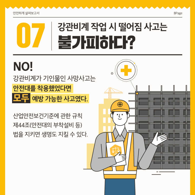 강관비계로 인한 사망사고는 안전대를 착용했었다면 모두 예방가능한 사고였습니다. 산업안전보건기준에 관한 규칙 제44조(안전대의 부착설비 등) 법을 지키면 생명도 지킬 수 있습니다.