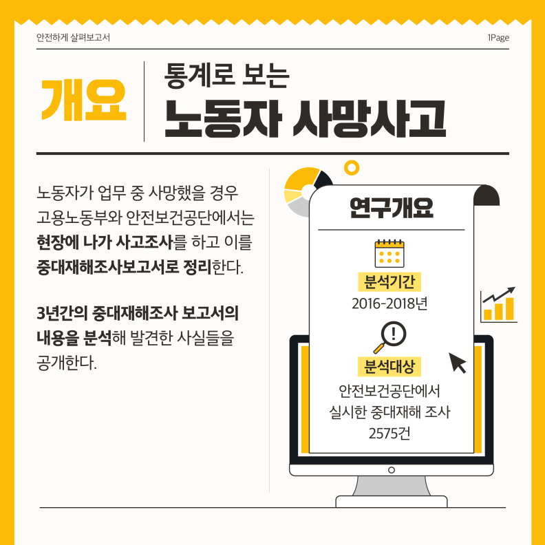 노동자가 업무 중 사망했을 경우 고용노동부와 안전보건공단에서는 사망 현장에 나가게 됩니다. 현장과 작업 환경 등 철저한 사고조사를 하고 이를 중대재해조사보고서로 정리해서 보고 및 전달하게 됩니다. 한 마디로 이 보고서만 보면 중대재해의 공통된 특성을 알 수 있고 어떻게 피할 수 있는지 그 아이디어도 얻을 수 있다는 말이지요! 3년 간의 중대재해조사 보고서의 내용을 분석해 발견한 사실들을 안전보건 공단에서 정리했습니다. 그 내용을 함께 알아보겠습니다.