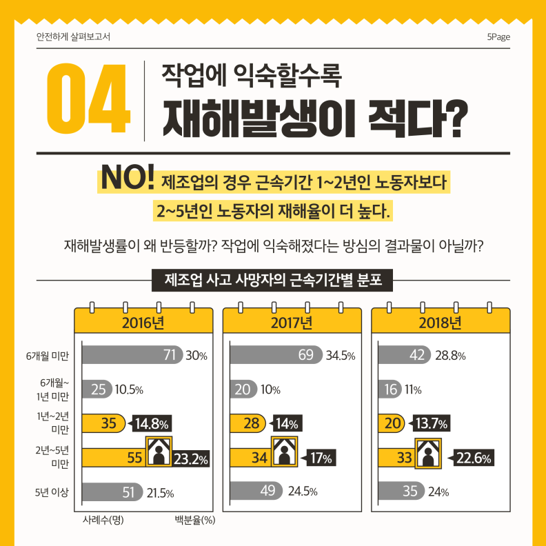 이 부분도 아마 위에서 나이와 관련이 있을 수 있을 것 같습니다. 하지만 제조업의 경우 근속기간 1~2년인 노동자보다 2~5년인 노동자의 재해율이 더 높습니다. 재해발생률이 반등하는 100% 명확한 이유를 확인하긴 어렵지만 작업에 익숙해졌다는 방심이 어떤 인과가 있다는 것을 부인하긴 어려울 것 같습니다.