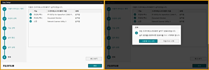 제록스프린터 및 복사기 드라이버의 설치가 완료가 되면 PC 또는 노트북의 전원을 리부팅을 물어봅니다. 지금 리부팅 또는 나중에 리부팅을 선택할 수 있습니다. 쉽고 빠르게 프린터 드라이버를 설치할 수 있었습니다.