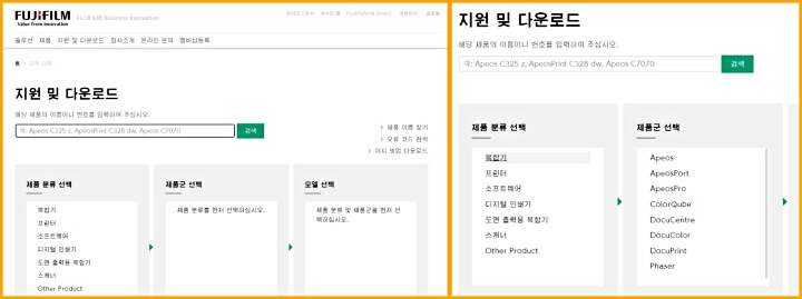 후지제록스 다운로드 센터에 방문하게 되면 다음과 같이 지원 및 다운로드를 받을수 있습니다. 사용하고 있는 제품의 모델명을 알고 있다면 쉽고 빠르게 검색할 수 있습니다.