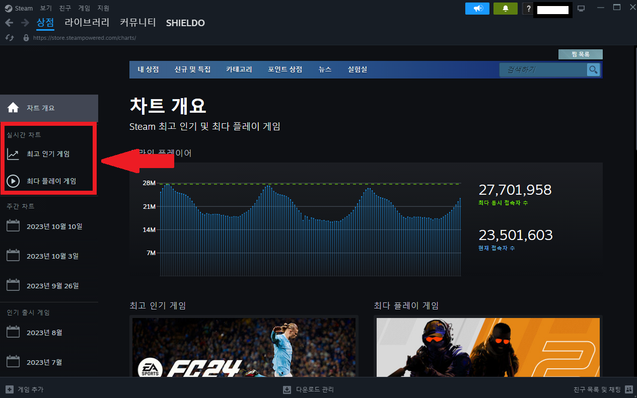 보통은 스팀게임 동시접속자나 수익 순위를 보기 위해 다른 사이트를 이용하시는 경우도 있는데요, 스팀 내에서도 당일 최다 동시접속자 수나 현제 얼마나 많은 플레이어가 게임을 진행하고 있는지도 알 수 있습니다. 뿐만 아니라 각 나라에서 어떤 게임이 가장 많은 수익을 얻었는지도 확인하실 수가 있습니다. 그럼 이제 바로 방법을 알려드리도록 하겠습니다.