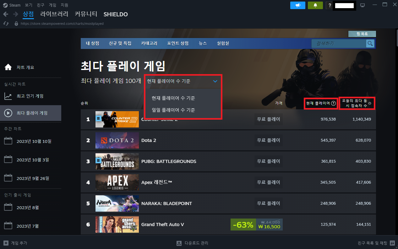 우선 최다 플레이 게임 창을 보면 현제 플레이어수, 오늘의 최다 동시 접속자 수를 알수 있습니다.