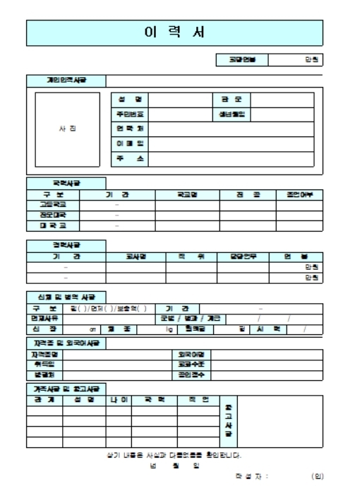 이력서 양식 무료다운 받은 자료에는 국내 기업을 위해 가장 기본이 되는 표준형이 있습니다. 이력서 양식 무료다운 받아서 본인이 지원하는 기업에 맞는 이력서을 찾아 작성한다면 2차 면접을 볼 수 있는 기회를 만들어 줄 수 있지 않을까요?