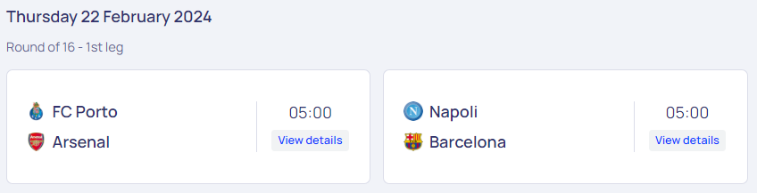 1차전 마지막 경기는 포르투갈의 FC포르투와 잉글랜드의 아스날, 그리고 이탈리아의 나폴리와 스페인의 FC바르셀로나입니다. 나폴리와 FC바르셀로나 역시 어떤 팀이 8강 진출에 성공할지 예측하기가 어려운데요, 나폴리가 이번 시즌 리그 순위가 좋지 않기는 하지만 16강 진출에는 성공했고, 리그에서 부진하더라도 챔스에서는 좋은 성적을 내는 팀들이 많기 때문에 끝까지 알 수 없는 경기가 될 수도 있다고 봅니다. FC포르투와 아스날과의 대결에서는 아스날이 조금 더 전력면에서 앞선다고 볼 수 있습니다. 하지만 결과는 어떻게 될지 모르니 끝까지 지켜봐야 하겠습니다.
